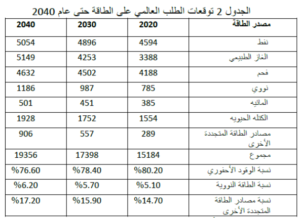 وعلى الرغم من التحول الواضح نحو استخدام مصادر الطاقة المتجددة، فإن هذا التحول بطيء للغاية. وبالمقارنة مع عام 2000، هناك استهلاك مرتفع للفحم والغاز الطبيعي وانخفاض في استهلاك الطاقة النووية والكهرمائية. وبالتالي، فإن الطاقة الأحفورية، بكل انبعاثاتها وآثارها البيئية، لا تزال المصدر الرئيسي للطاقة في العالم. النفط والفحم والغاز الطبيعي يوفر جوهر هيكل الطاقة والتنمية للاقتصاد العالمي. ومن المتوقع أن تستمر هيمنة مصادر الطاقة التقليدية على المدى القصير، مع توقع حدوث تحول تدريجي في الاعتماد على مصادر الطاقة المتجددة على المدى الطويل. ويبين الجدول 2 توقعات أوبك للطلب العالمي على الطاقة حتى[1] عام 2040.
