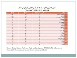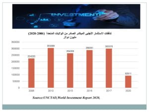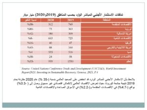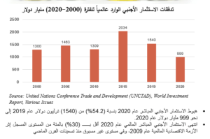 • انتهى الاستثمار الأجنبي المباشر العالمي عام 2020 أقل بــــــ (30%) بالمئة من المستوى المسجل إثر الأزمة الاقتصادية العالمية عام 2009، وفي مستوى غير مسبوق منذ تسعينات القرن الماضي