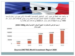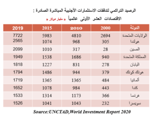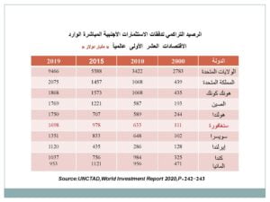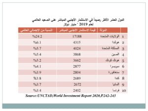 • هبوط الاستثمار الأجنبي المباشر عام 2020 بنسبة (54.2%) من (1540) ترليون دولار عام 2019 إلى نحو 999 مليار دولار عام 2020.