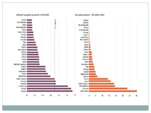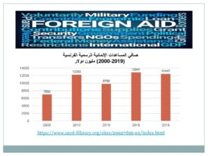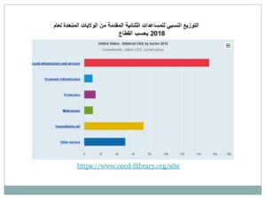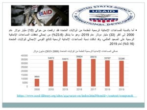 • أما بالنسبة للمساعدات الإنمائية الرسمية المقدمة من الولايات المتحدة فقد ارتفعت من حوالي (10) مليار دولار عام 2000 إلى أكثر (33) مليار دولار عام 2019، وهو ما يشكل (23.6%) من إجمالي تدفقات المساعدات الإنمائية الرسمية على الصعيد العالمي، وقد شكلت نسبة المساعدات الإنمائية الرسمية للناتج القومي الإجمالي للولايات المتحدة (0.16%) لعام 2019.