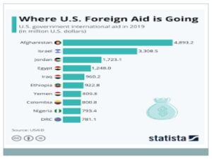 • ذهبت أعلى مساعدات عام 2019 إلى أفغانستان بقيمة (4839) مليون دولار أي بنسبة (14.5%) ،ثم إسرائيل ( 3308) مليون دولار بنسبة (9.9%). ثم الأردن (1723) مليون دولار بنسبة (5.2%)، ثم مصر (1248) مليون دولار بنسبة (3.7%)، يليها العراق (960) مليون دولار بنسبة (2.9%).