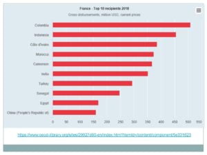Øاستحوذت الدول الأفريقية جنوب الصحراء على حوالي (33%) من إجمالي المساعدات الفرنسية المقدمة عام 2018 ، تليها دول الشرق الأوسط وشمال افريقيا بنسبة (18%)، ثم دول أمريكا اللاتينية والبحر الكاريبي بنسبة (12%).وكانت كولومبيا و المغرب وإندونيسيا  والكاميرون والسنغال في مقدمة الدول المتلقية للمساعدات الفرنسية للعام 2018.