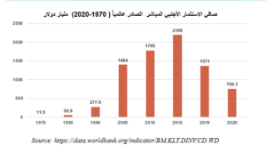 • ارتفعت تدفقات الاستثمار الأجنبي الصادر عالميا من قرابة (12) مليار دولار عام 1970 إلى (2199) مليار دولار عام 2015، ثم شهد انخفض خلال السنوات الخمس المنصرمة حنى وصل إلى(758) مليار دولار عام 2020 وذلك نتيجة للإغلاقات والتدابير الاحترازية التي قامت بها معظم دول العالم لمواجهة تداعيات جائحة كورونا، مما أثر على التدفقات الاستثمارية العالمية.