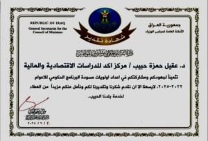 Akkad Center for Economic and Financial Studies receives a certificate of appreciation from the General Secretariat of the Iraqi Council of Ministers for its participation in preparing a draft of the priorities of the government program for the Iraqi government 2022-2025.